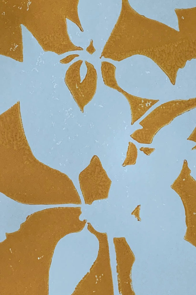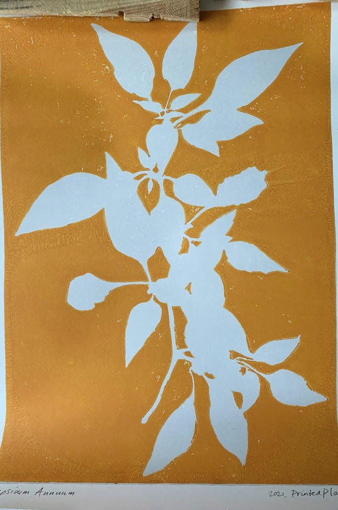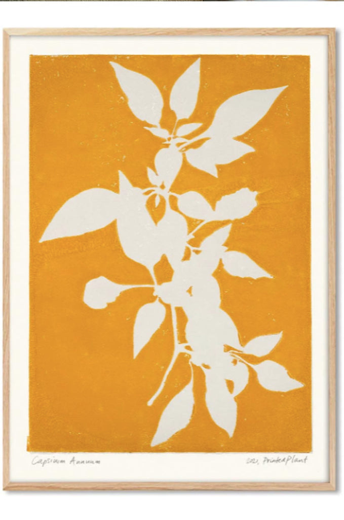 This print is of the Capiscum Anuuum Plant silhouetted on a rich butterscotch background colour.