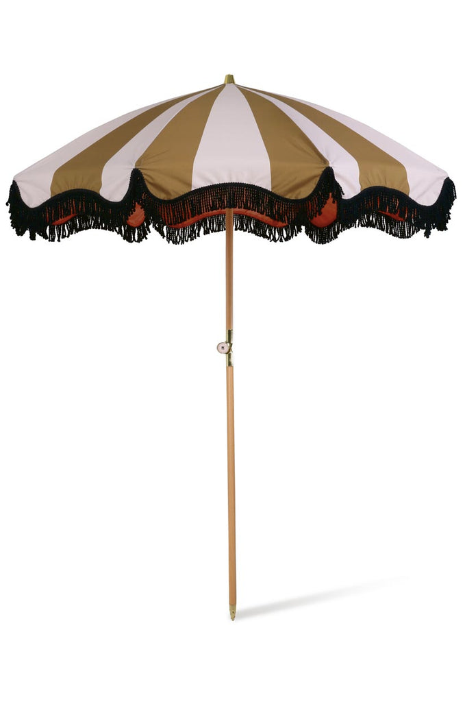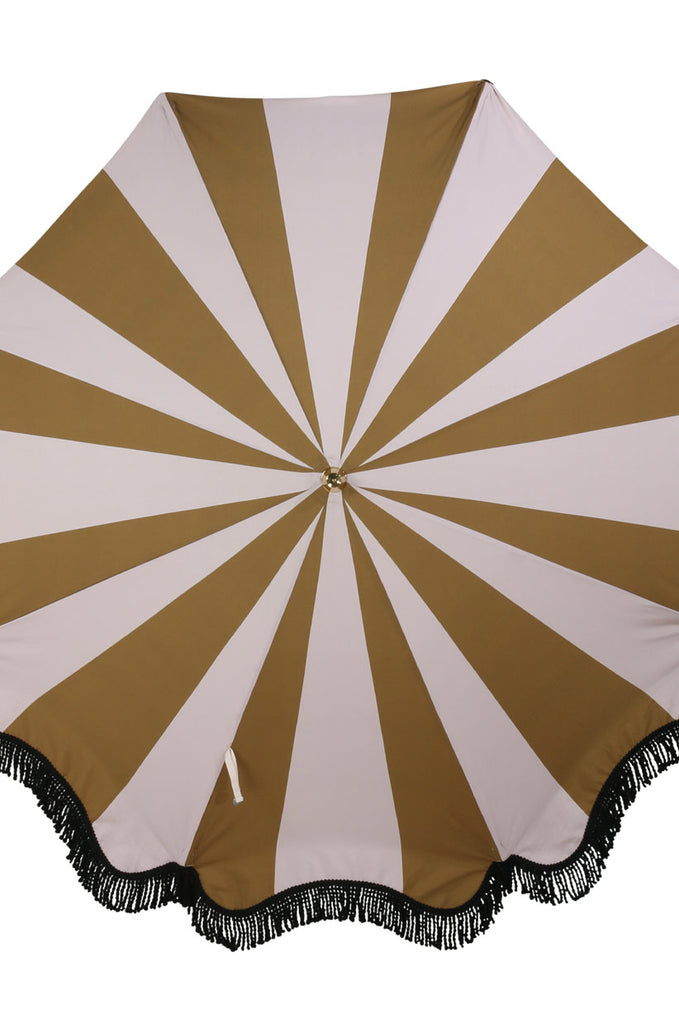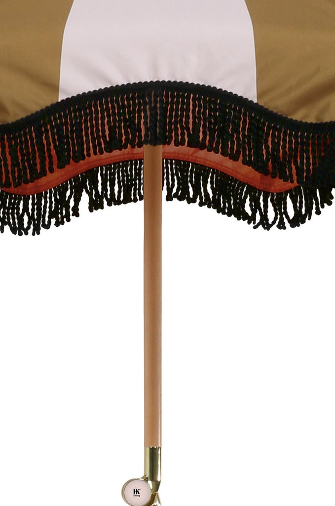 beech wooden pole, steel wire ribs, polyester fabric, brass parts.
