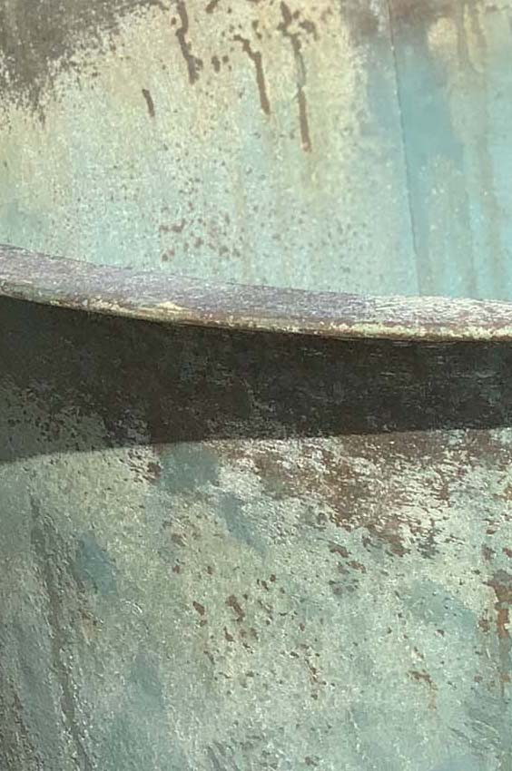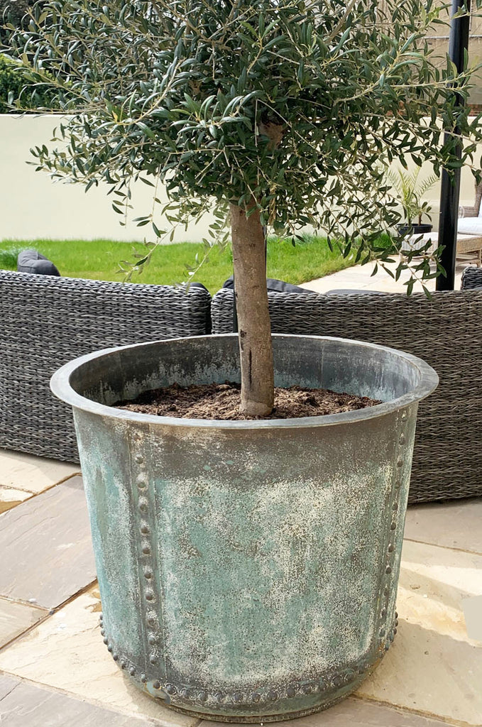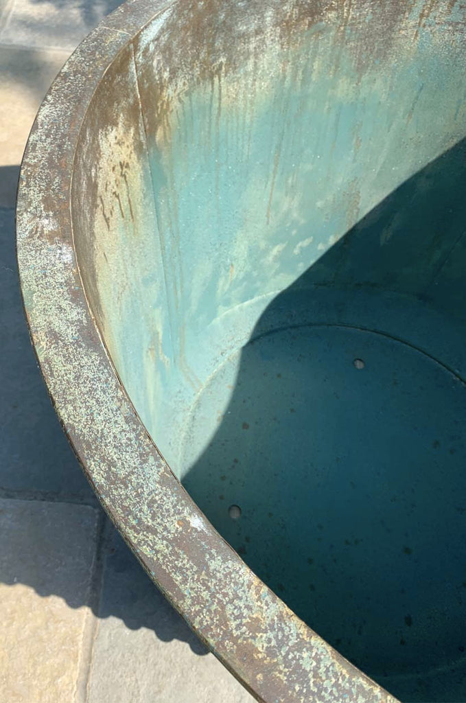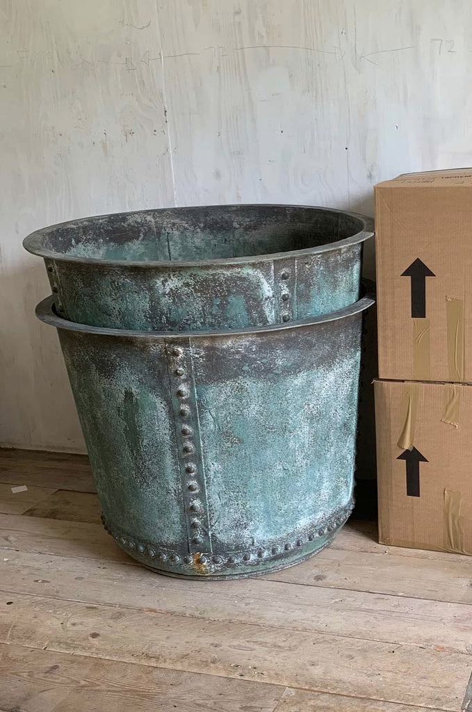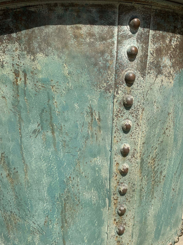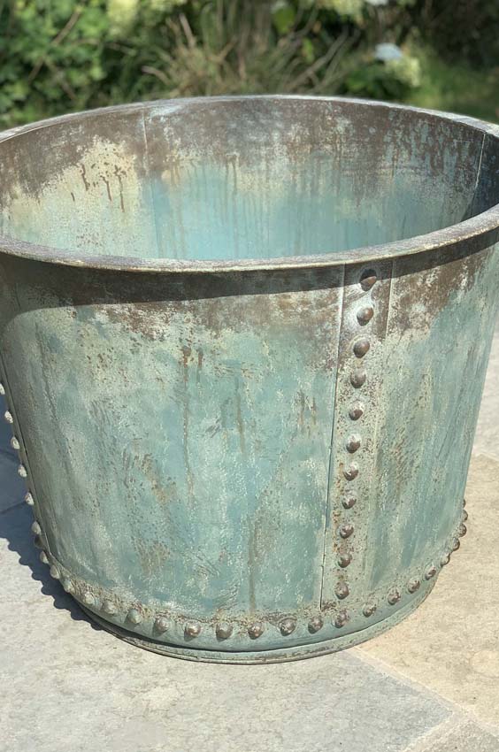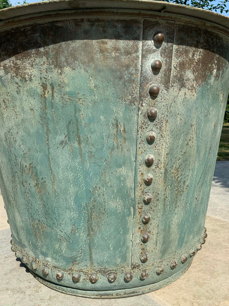 Crafted from iron with riveted sides and 3 aeration holes at the bottom with a patinated verdigris finish to resemble the original copper ones.