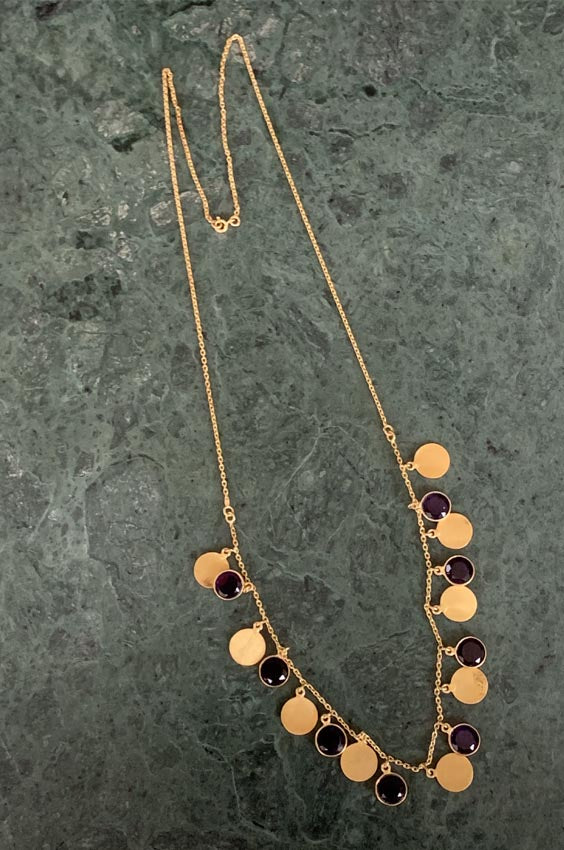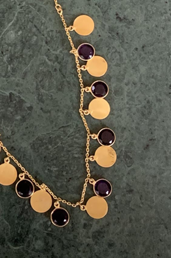 Beautiful 14 Kt Gold Vermeil plated on sterling silver discs hang from this gold chain with semi precious amethysts stones dripping in between each disc.