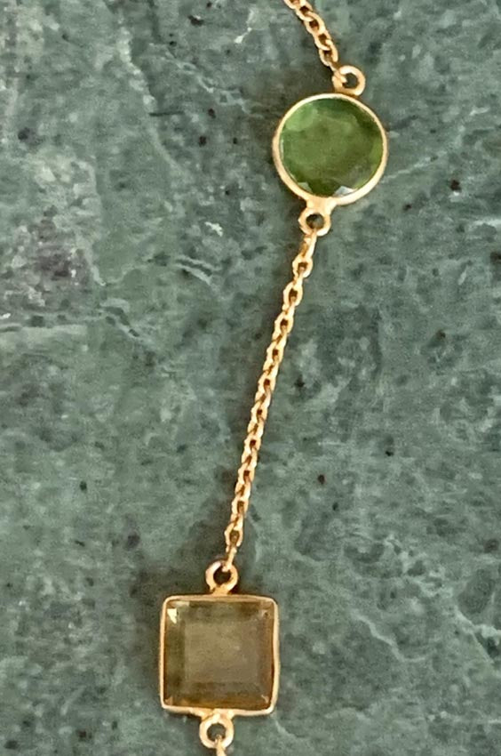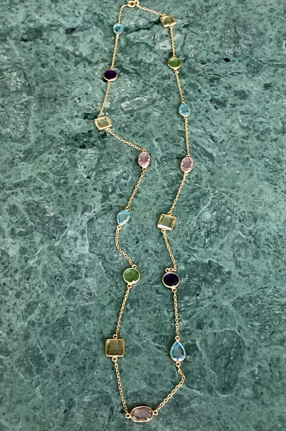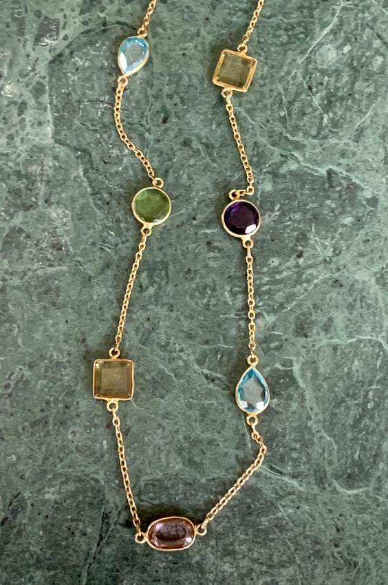 Add multicolour gems over your dark sweaters in winter or in summer with a low neck dress. This necklace is sterling silver with 14 Carat gold vermeil. Each gem is a semi precious stone.